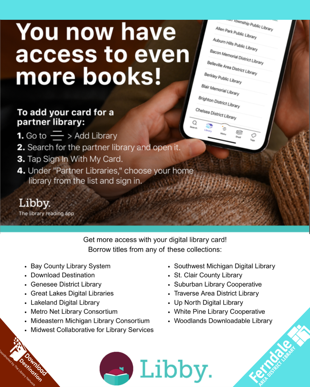 Ferndale Area District Library is part of The Library Network's DOWNLOAD DESTINATION cooperative, and typically, when you're searching for certain titles, you'll have to "place a hold" because someone else is actually reading that digital copy. But NOW, you can add OTHER partner libraries and Michigan consortia to your digital library card.