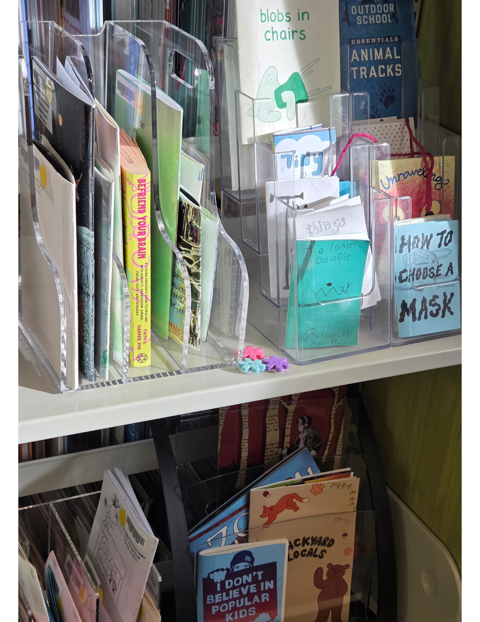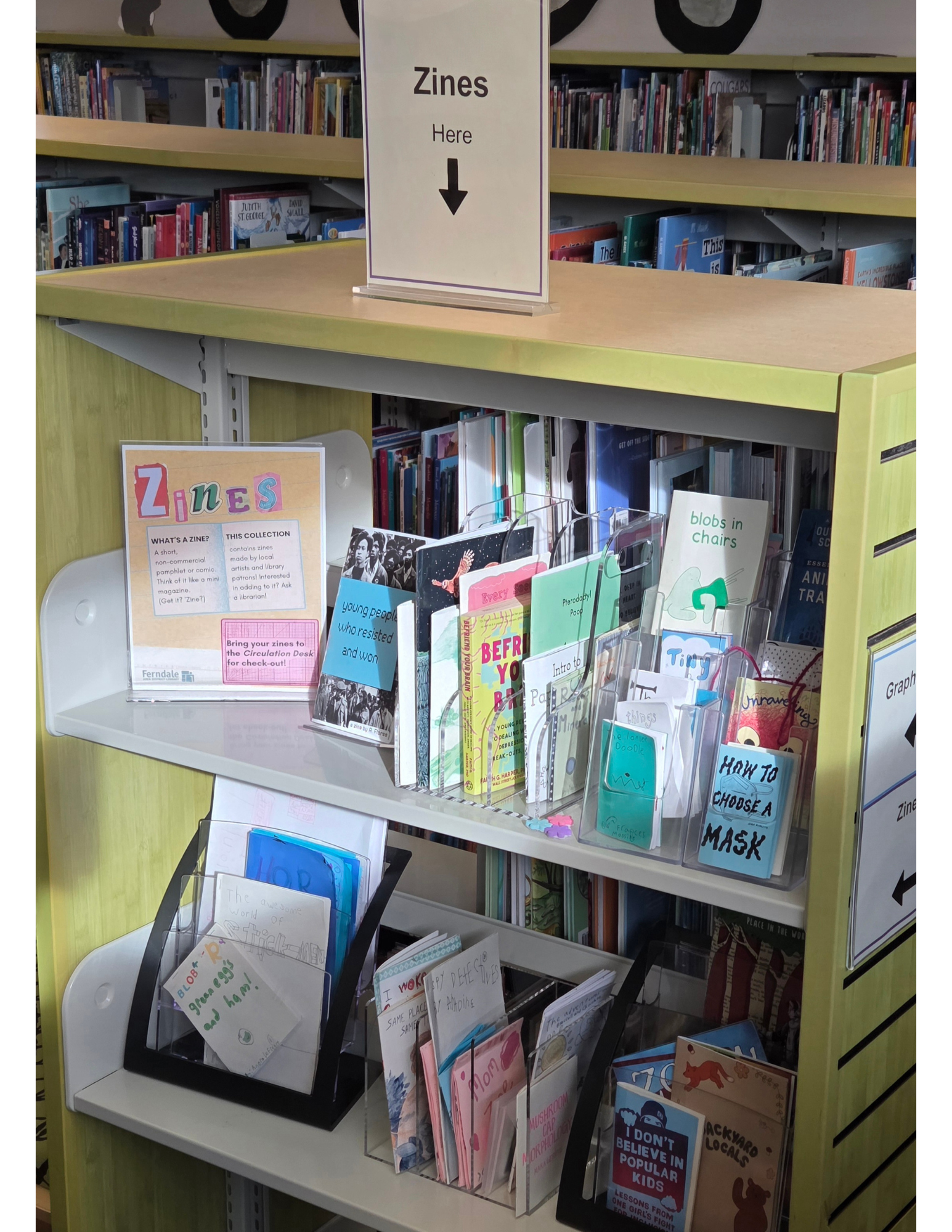 The purpose of maintaining this collection is to empower library users to create and contribute within the library environment. Including zines in the library space also aims to diversify the voices featured in our collections and help young patrons and local creators see themselves represented on the shelves.